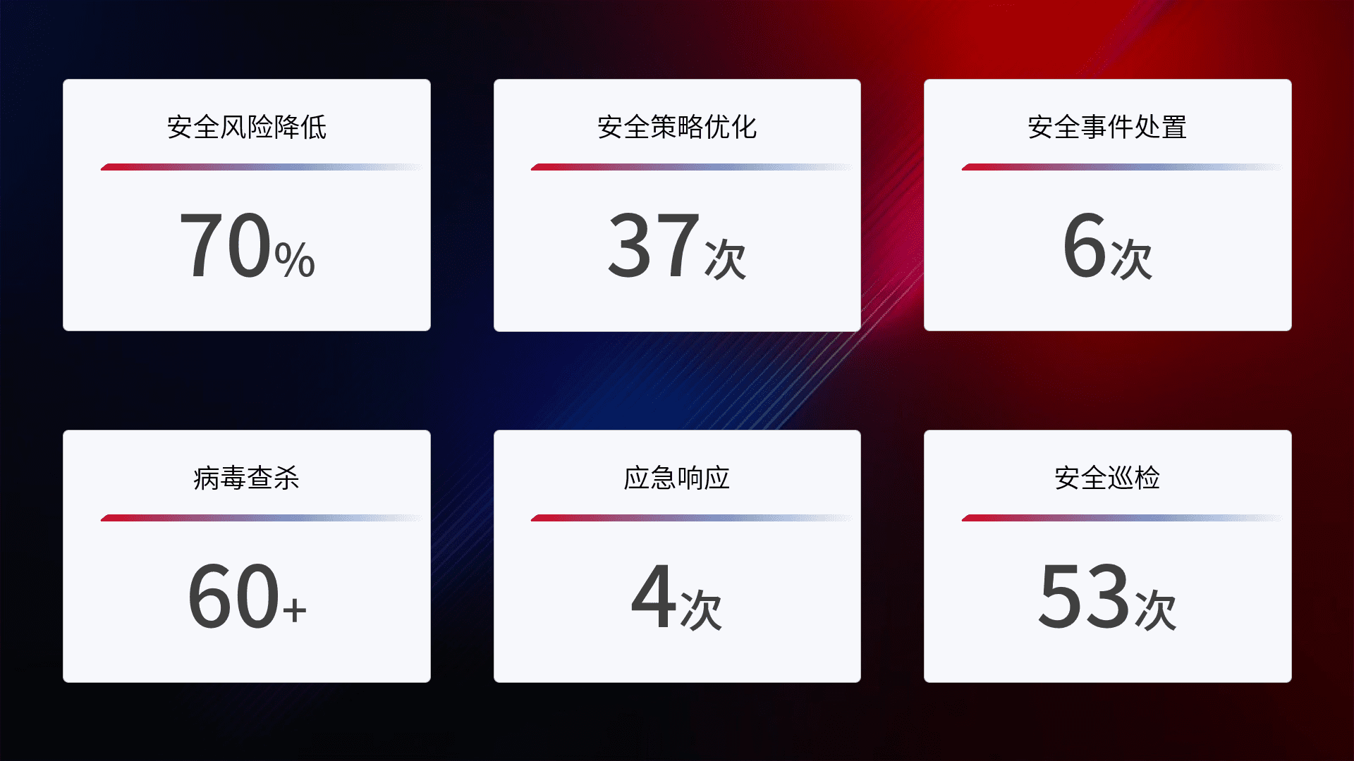 提供全面的安全事件报告体系,,,包括处置报告、、、、周报、、、、季度和年度总结,,结合持续监控,,,帮助客户深入了解网络安全状况。。。
