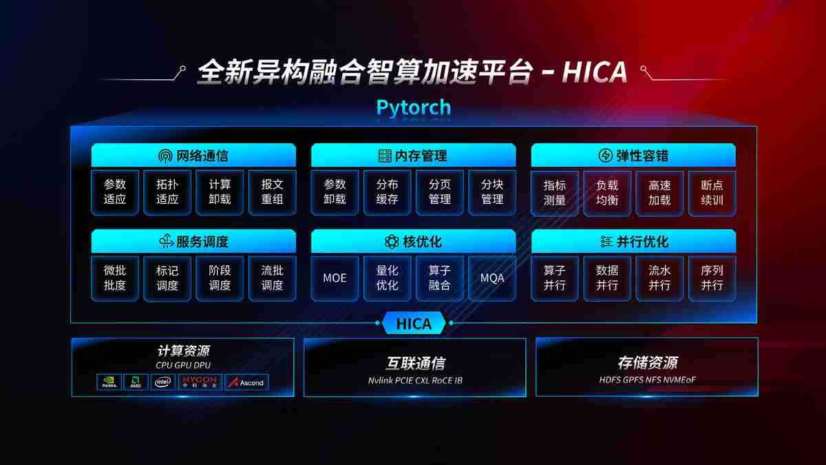 通过自研的服务层、、中间适配层、、以及调度编排算法,,采用数据并行、、、、模型并行等多种并行方式,,,把并行计算任务进行有效的分解,,使其分别由相应的软件栈和算力资源来承接。。。。当GPU资源变化,,,HICA可以实时动态调度计算子任务并调整模型拓扑和架构,,以充分聚合各种算力资源。。。。