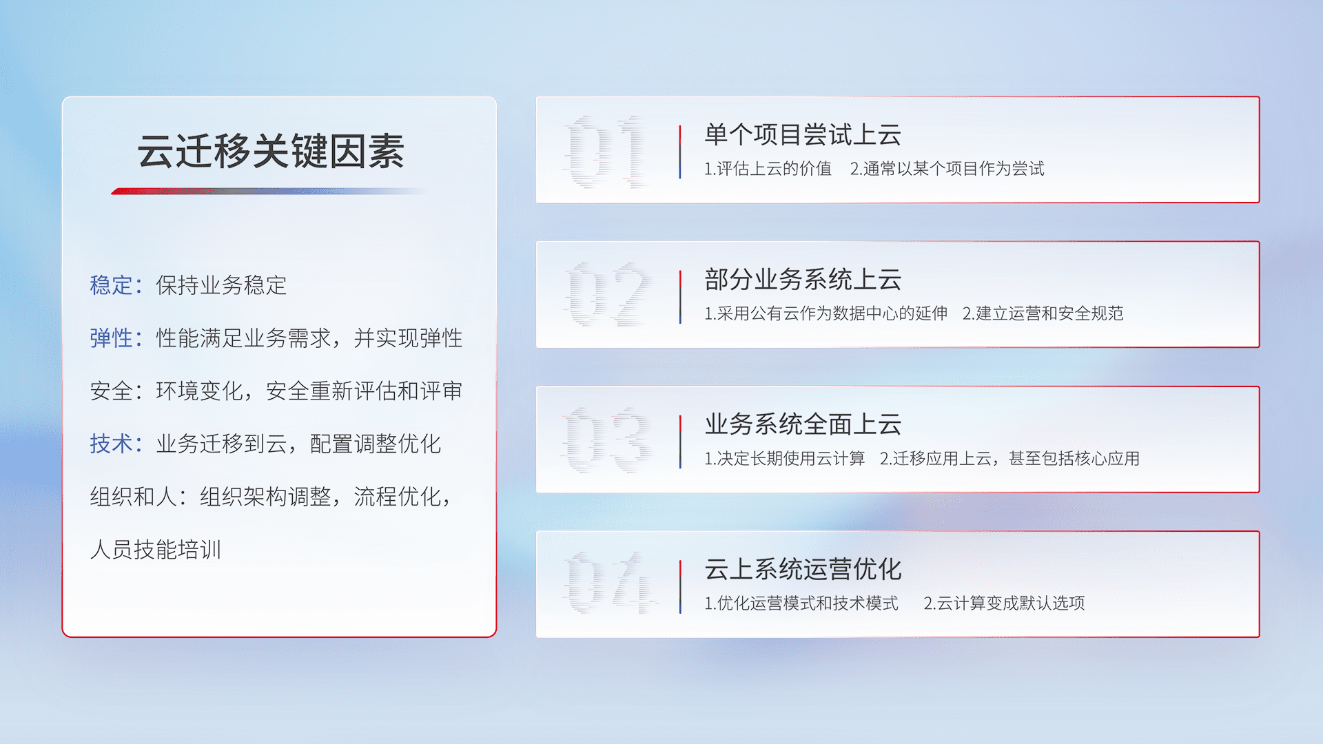结合实际业务,,,从规划设计、、、云平台选型、、云原生改造、、、数据迁移、、、、集成交付,,,,迁移全过程为客户识别最佳上云路径,,,做好风险识别管理,,,,设计网络架构、、、身份权限、、安全审计合规、、、操作审计、、、、日志审计、、、、监控告警策略、、、多站点容灾设计等,,,对云上基础设施进行整体规划,,,提升IT治理水平,,以满足弹性、、、、高可用、、高性能的需求。。